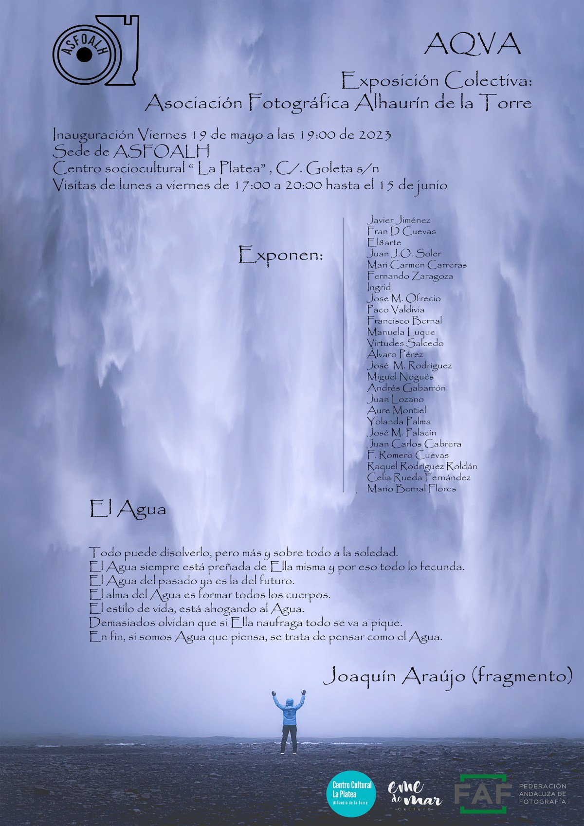 Este año ha sido invitada la Asociación Fotográfica de Alhaurín de la Torre – ASFOALH, en la que estamos integrados, participando con sus obras: nuestro presidente Miguel Nogues, nuestra socia fundadora Mari Carmen Sedeño y nuestros estimados y admirados socios y socias Virtudes Salcedo, Ingrid Mekionyte y Fran Garrido.