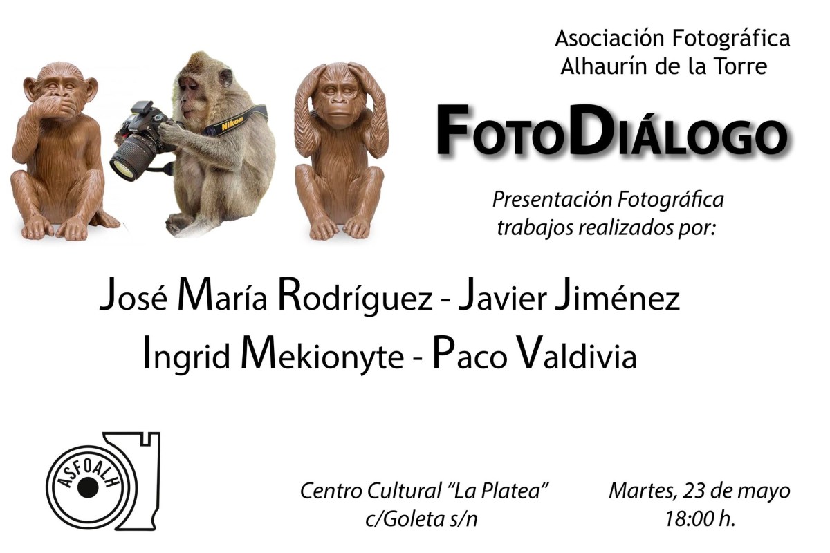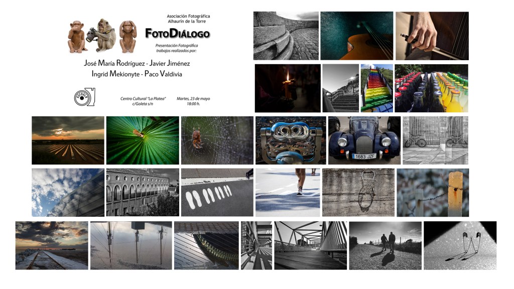 Nuestro II Fotodiálogo celebrado el 23 de mayo en La Platea, ha sido todo un reto que ha supuesto un esfuerzo de nuestros socios y socia ponentes para superar sus obras. Los trabajos expuestos por las parejas Ingrid Mekionyte – Paco Valdivia y José M. Rodríguez – Javier Jiménez ha sido todo un éxito entre los socios que acudieron a la cita, un total de 15.