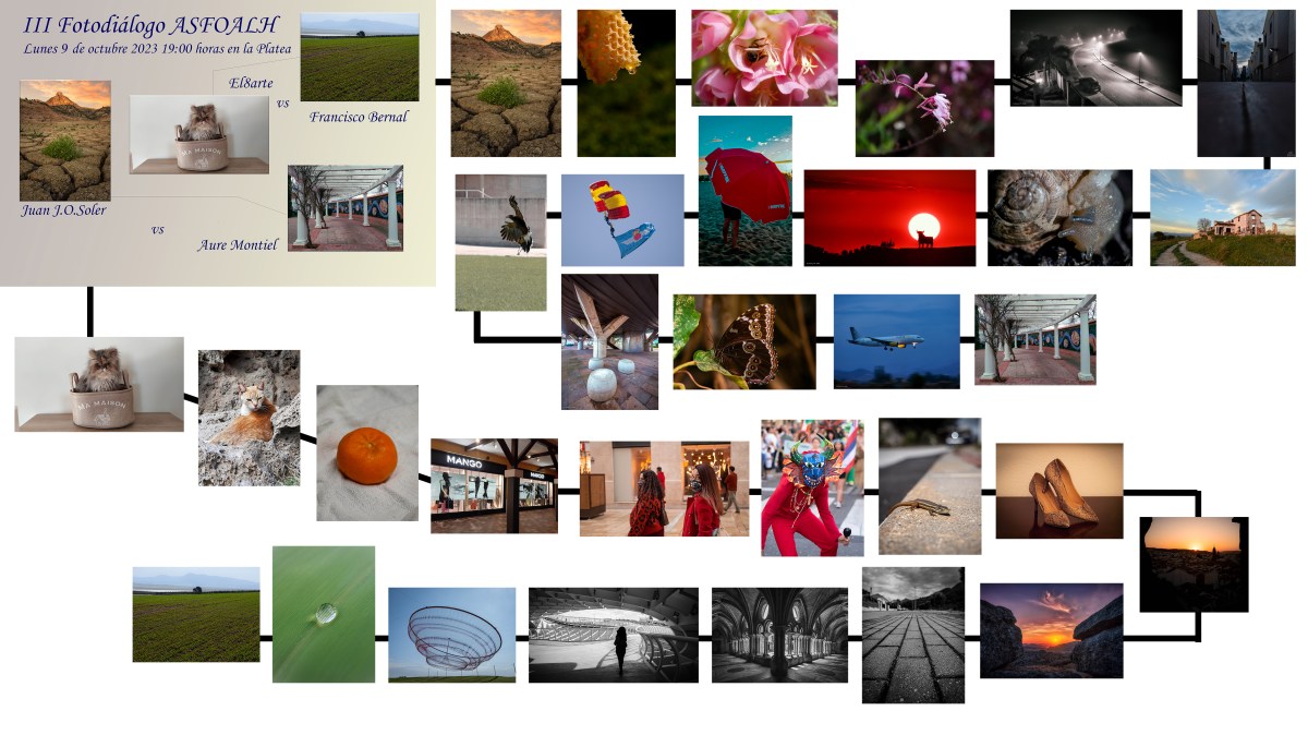 Celebrado el 10 de Octubre de 2023 en nuestra sede de La Platea y protagonizado por El8arte vs Paco Bernal y Aure vs Juan J.O. Soler. Nuevamente ha representado un reto analítico para los dialogantes y un agradable entretenimiento para los asistentes, un total de 15 socios y socias que enriquecen su cultura fotográfica con la observación y la escucha.